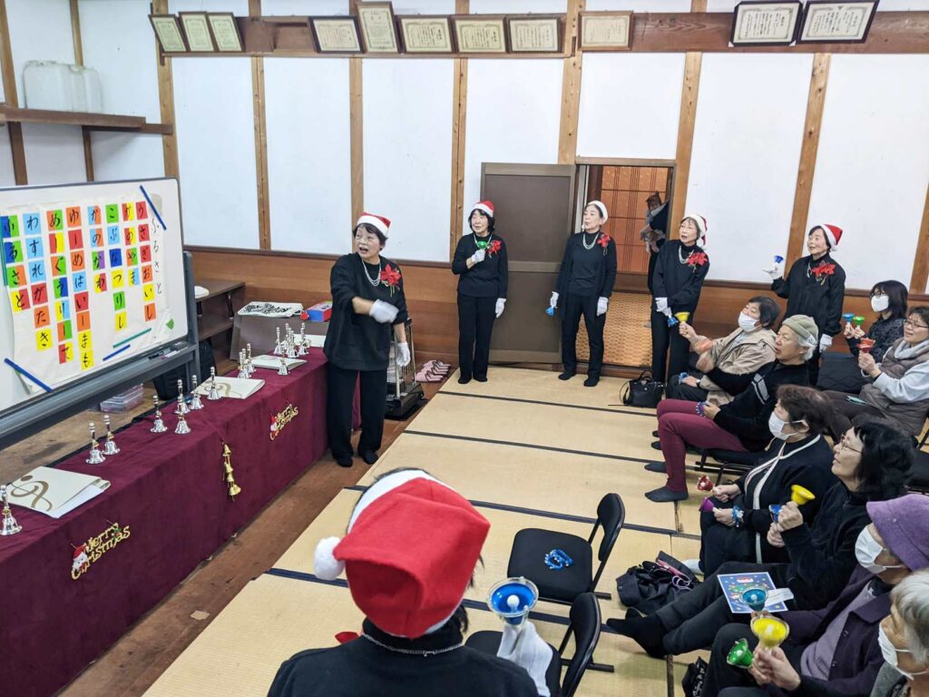 ハンドベルではみんなでベルを振ったり、懐かしい歌を歌う時間もあり、手を使った体操も教えてくださり、みなさん笑顔で楽しんでおられました。