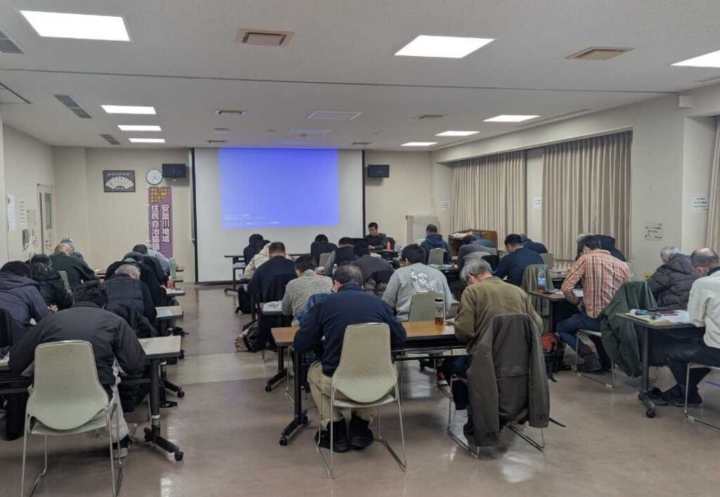 29名の皆さんが参加をされ、全員が見事に合格されました。特に2日目の実技講習は、あいにくの雪の日になり、前日までの大雪で積もった雪山を使用する講習となりました。修得していただいた技能を今後は、仕事や地域の事業に生かしていただけることを願うばかりです。参加者の皆さん寒い中、長時間にわたり本当にお疲れさまでした。